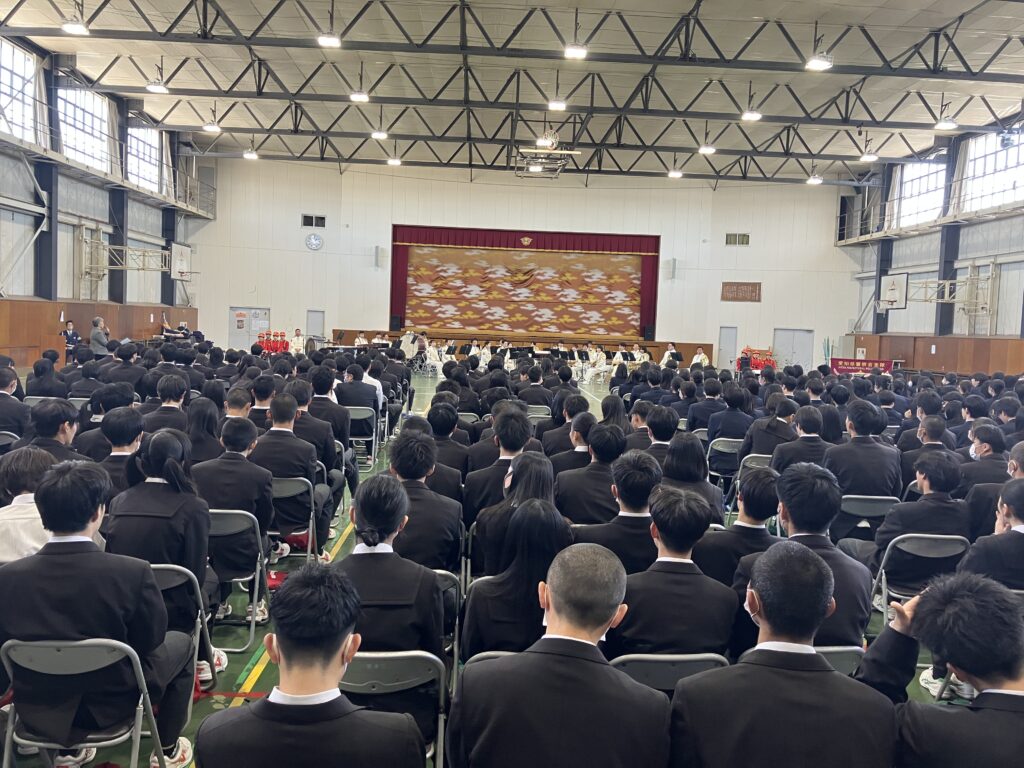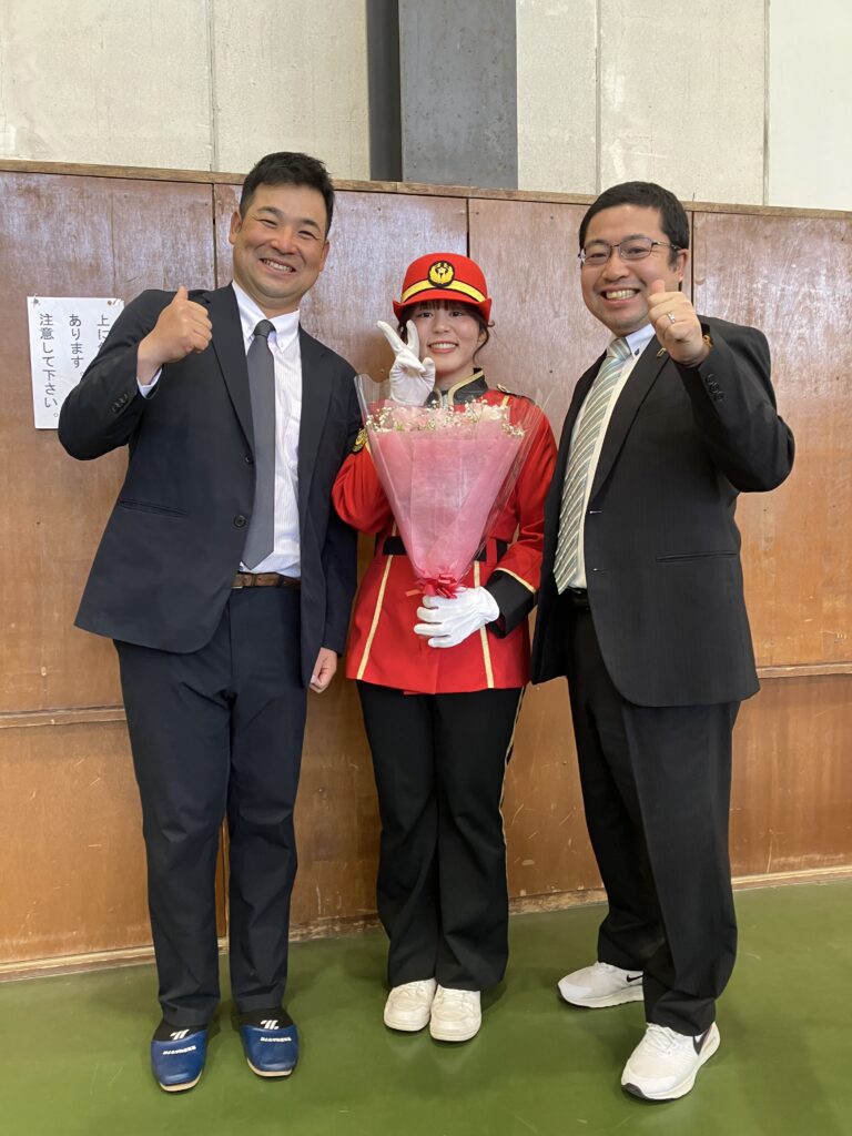 カラーガード隊でご活躍中の本校卒業生(剣道部OB)長島 千亜子さんからは、警察官という仕事の魅力、高校3年間を精一杯頑張ることの大切さなど、在校生へたくさんのメッセージをいただきました。