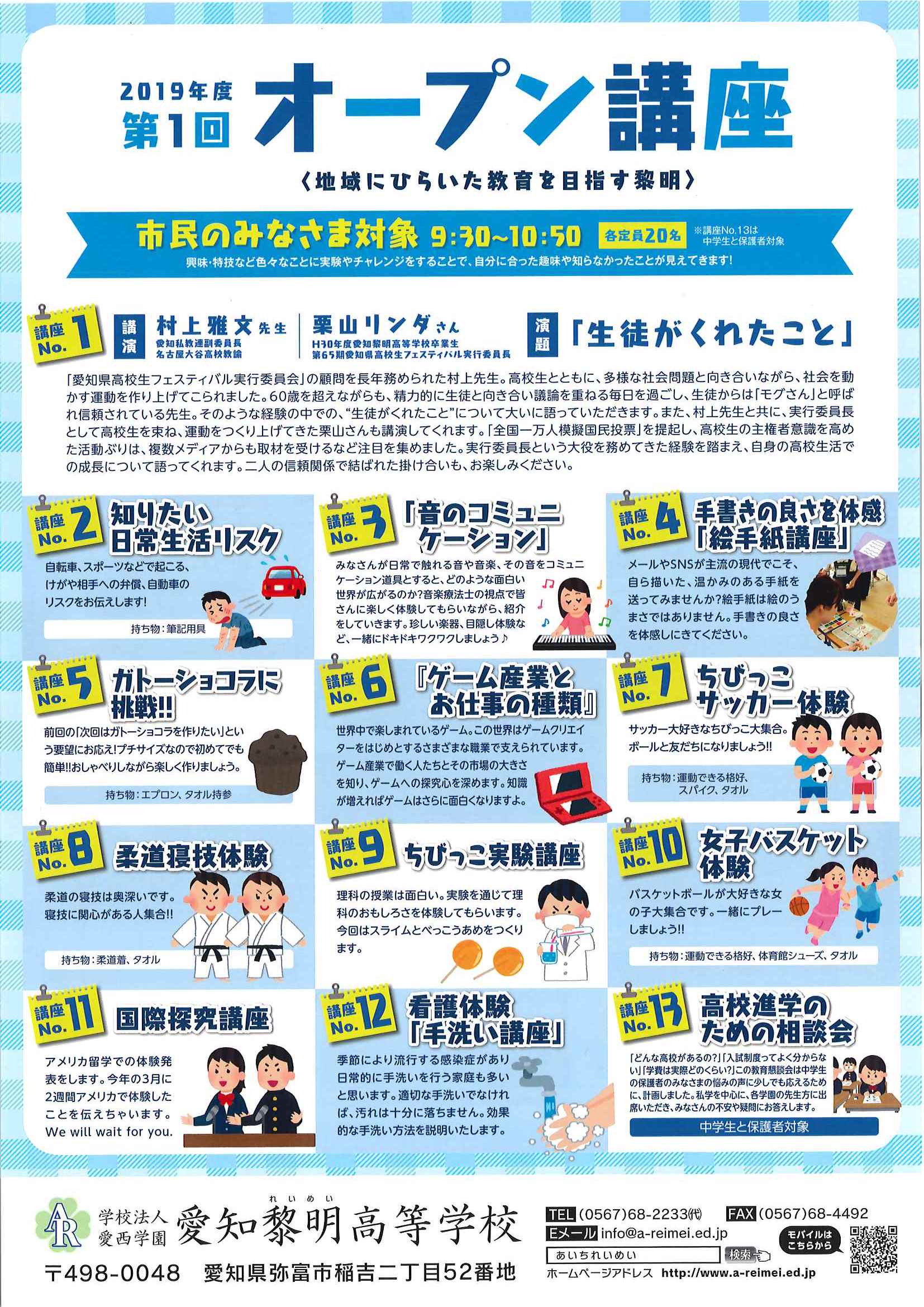 第1回 オープン講座のご案内 カテゴリ:入試・見学会|掲載日:2019年06月04日 2019年度の第1回オープン講座のご案内です。 この日は、学校開放日になっていますので地域の方々お気軽に参加ください。 第1回は13講座を用意しました。 下にあるチラシをご覧になって、ぜひ参加ください。 「黎明高校の講座」だけでなく、 「趣味の講座」や 「ちびっこ講座」 「高校入試相談講座」など いろいろな講座を用意しました。 入試・見学会一覧へ戻る